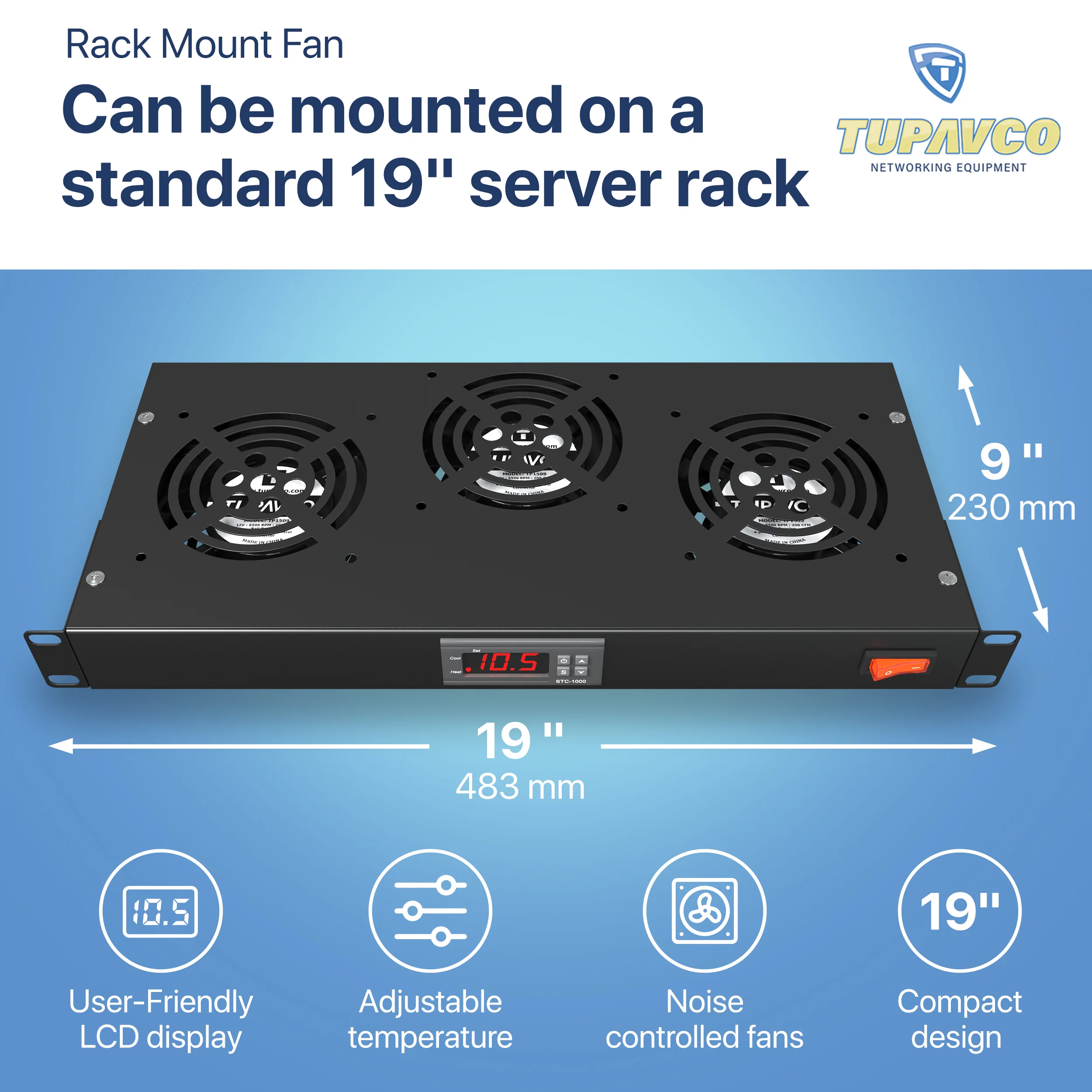 Compact design mounts to any 19" inch cabinet and takes up only 1 unit of space Simple and easy to use LCD display allows user to control temperature. Noise controlled fans make the cooling system useful for a quiet office or business space.